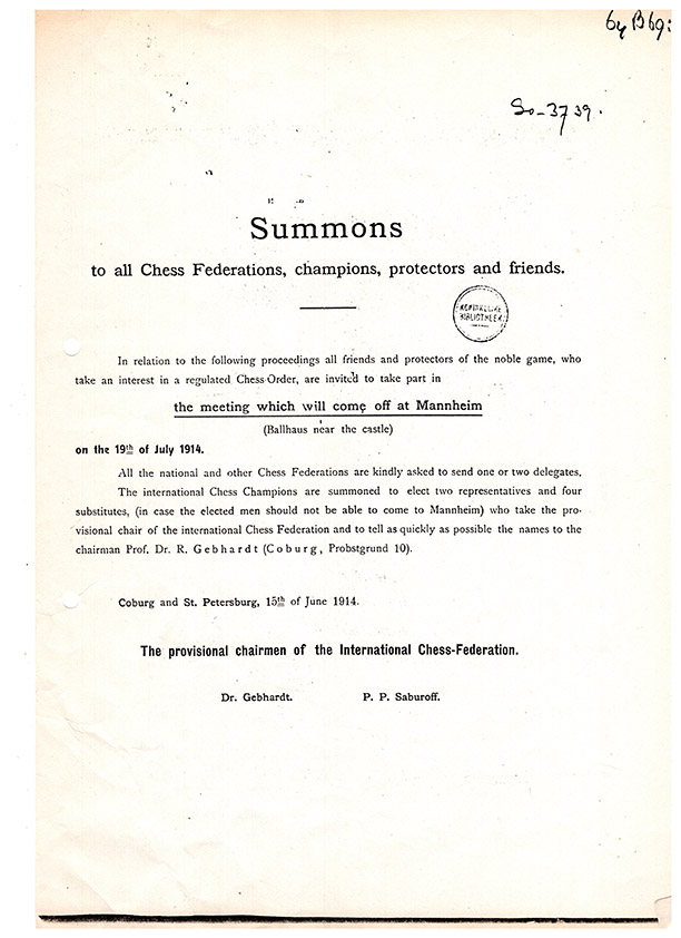 Letter calling chess federations to take part in the meeting to create an international organization and the proceedings of that meeting